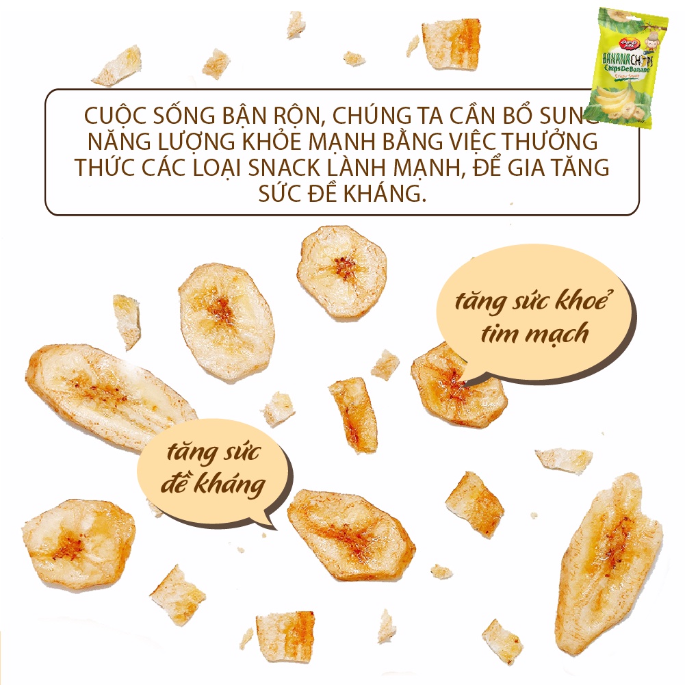 + Chuối sấy là một sản phẩm đặc biệt được làm từ quả chuối tươi ngon được chọn lựa kỹ càng và sấy khô với công nghệ hiện đại, giữ nguyên được hương vị tự nhiên của chuối.