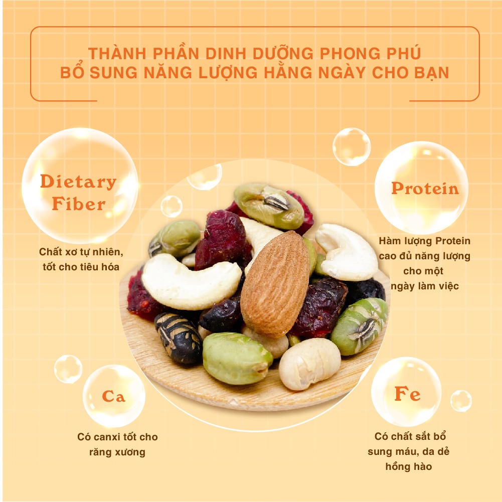 + Thành phần: các loại hạt tự nhiên. Bao gồm: Hạt điều, hạnh nhân, hạt bí, nam việt quất, cherry khô.